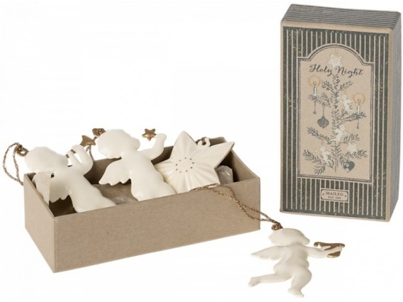 Stwórz wyjątkową atmosferę świąt w swoim domu i przystrój choinkę magicznymi ozdobami marki Maileg. W komplecie znajdują się 4 różne ozdoby, które są ręcznie malowane w celu zapewnienia jedynego w swoim rodzaju wykończenia.